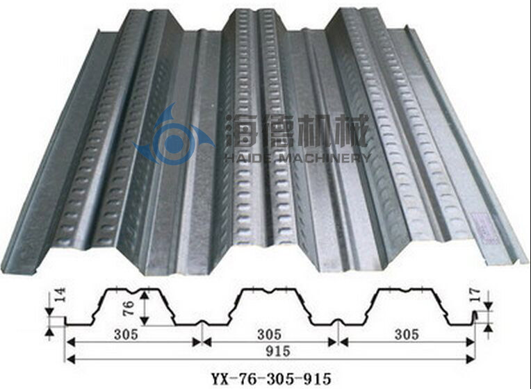 該機(jī)生產(chǎn)的鋼樓承板形狀簡(jiǎn)潔、波度大、強(qiáng)度高、安裝時(shí)鋪置點(diǎn)焊鋼筋網(wǎng)后與混凝土現(xiàn)場(chǎng)澆灌結(jié)合,粘合性好。在高層建筑上既可以省去鋼模板又可以減輕樓層承載,在達(dá)到同等承受能力的前提下,使工程用鋼量減少,從節(jié)省投資。
